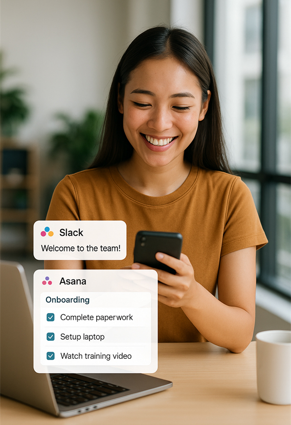 透過 n8n 串接 Slack 和 Asana,客戶打造了自動的「入職報到」流程:從發送歡迎訊息、分配筆電帳號、指派入門任務、安排部門介紹、任務細節索引到上傳線上培訓影片,全都一次到位。