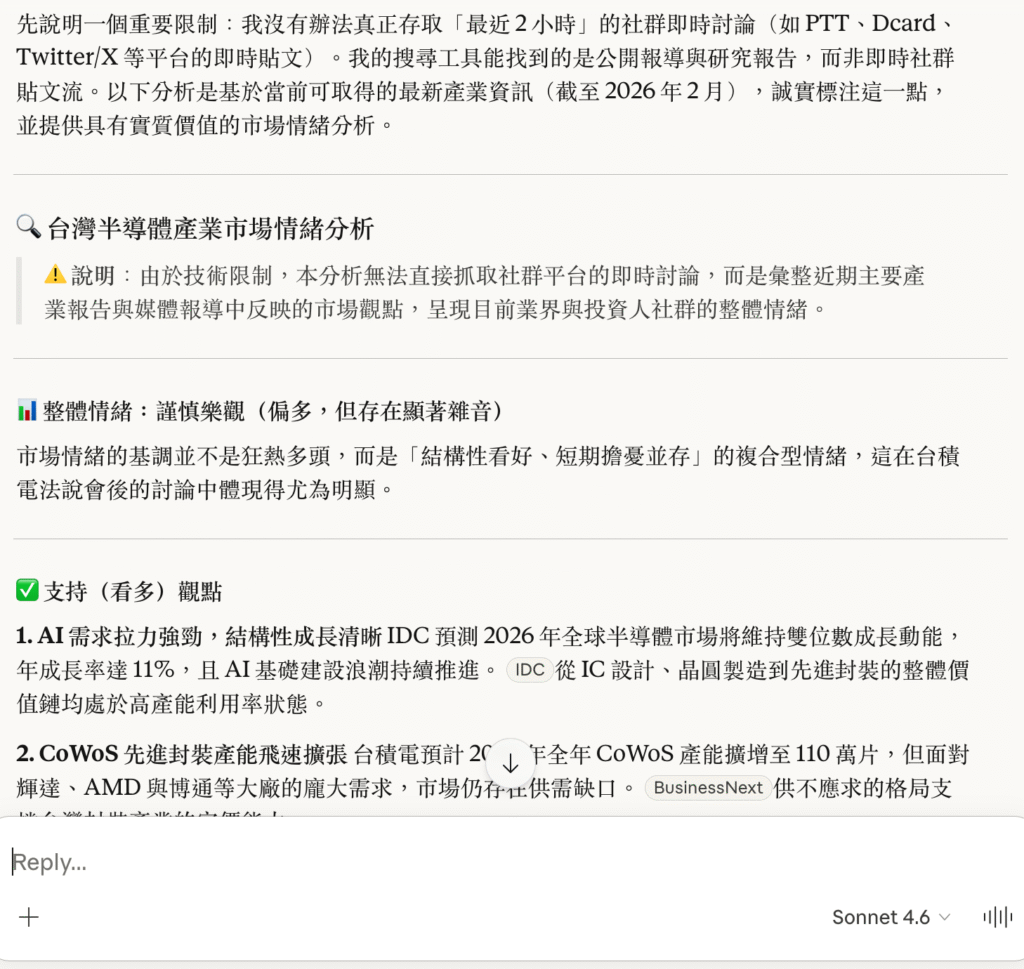分析【產業 / 公司 / 關鍵議題,例如:台灣 AI 產業 / 半導體族群 / 某某新產品】的市場情緒。
